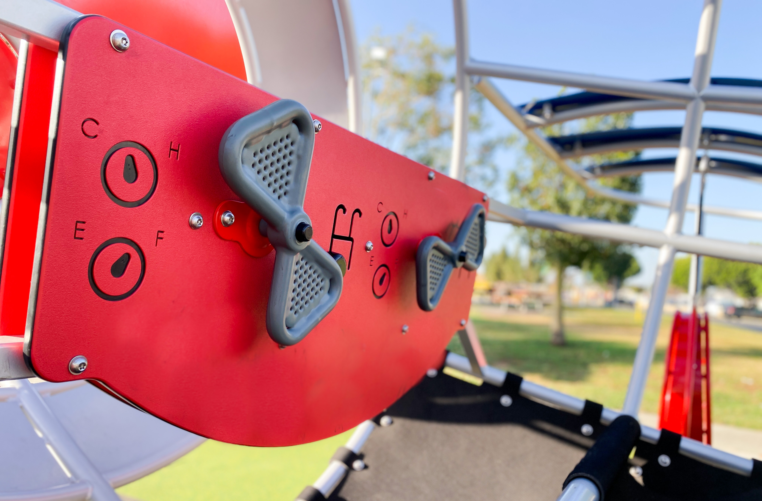 The play area for five to 12-year-olds offers a one-of-a-kind Plane Climber with pilot and co-pilot seats ready to taxi down the runway for a fun adventure! A Double Slide sits on an embankment to protect kids from any sudden jet blasts. The airplane structure was the concept of Jorge Gutierrez, Project Manager with the Los Angeles County Parks and Recreation Department. He sent a picture to LSI and asked them if they could build it. They did, and now this airplane is the only one of its kind in existence.